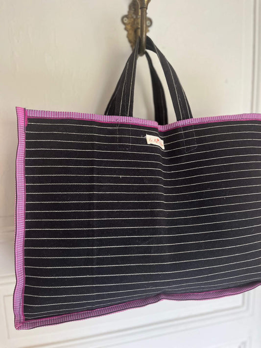 Cabas en toile rayé noir avec bord rose – Sac cabas grand format