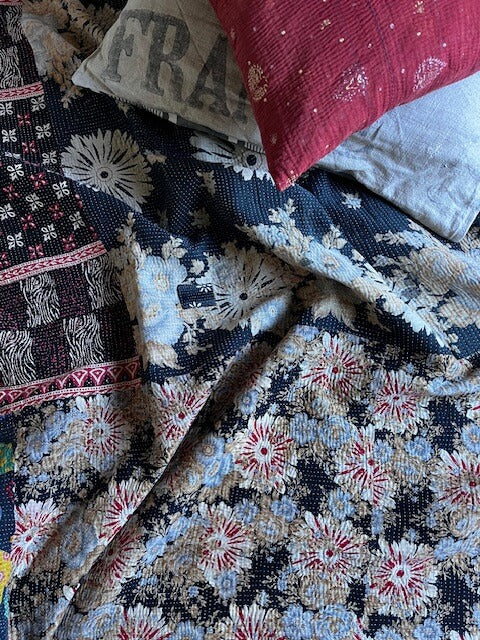 Kantha Indien Fait Main – Couvre-lit Réversible Bleu Marine 125x200