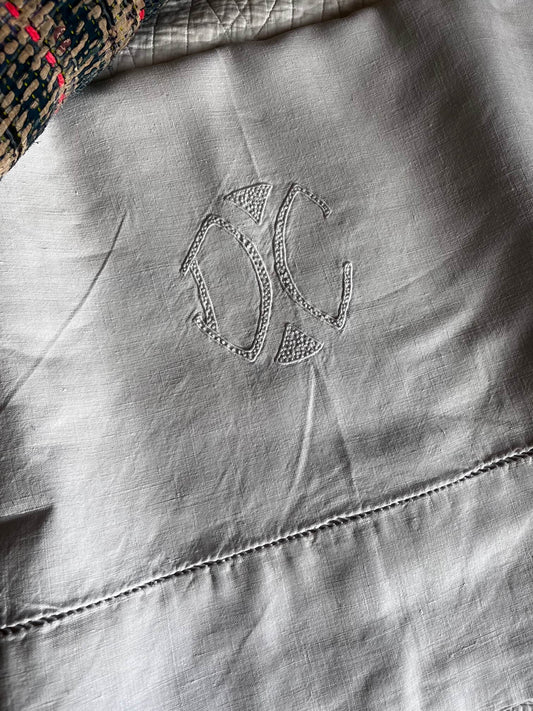 Antique Linen Bed Sheet with Hand-Embroidered DC Monogram – One-of-a-Kind Piece
