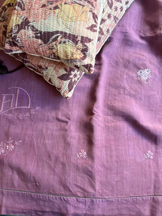 Antique Dyed Bed Sheet in Dusty Rose – Embroidered Vintage Cotton Linen