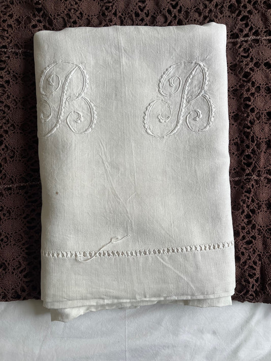 Antique Linen Bed Sheet with Hand-Embroidered BB Monogram – One-of-a-Kind Piece
