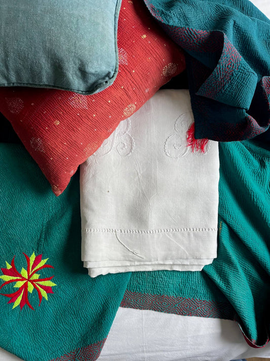 Handmade Indian Kantha – Reversible Cotton Bedspread Green 140 × 210 cm