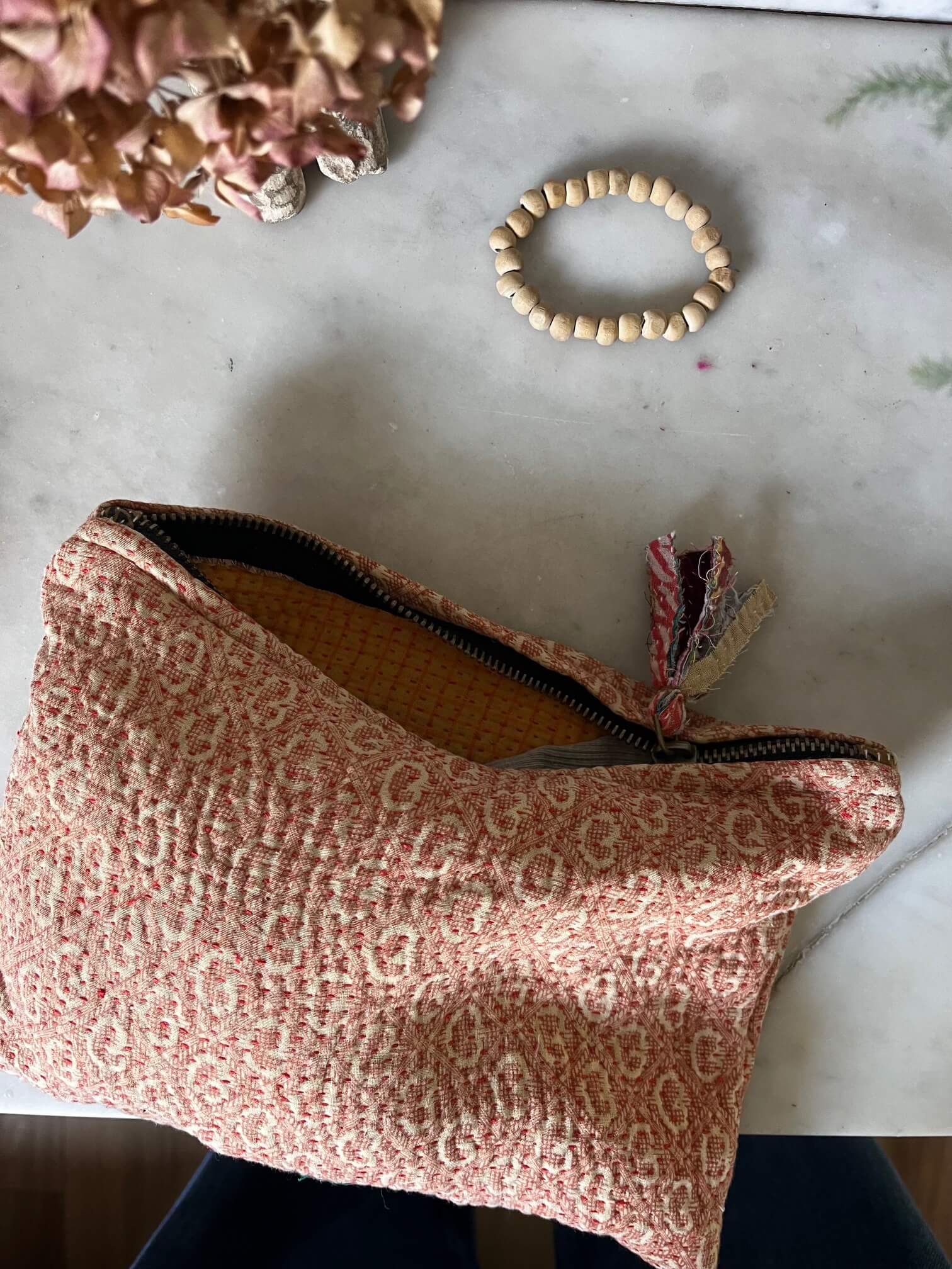 Leather and kantha pouch. The size is 23 x19cm. Bell on the side. Practical in a bag to store your papers without creasing them or to carry only what you need. They are flexible but still have some hold. Several colors available but which one to choose...practical, pretty, original and nice, what more could you ask for?