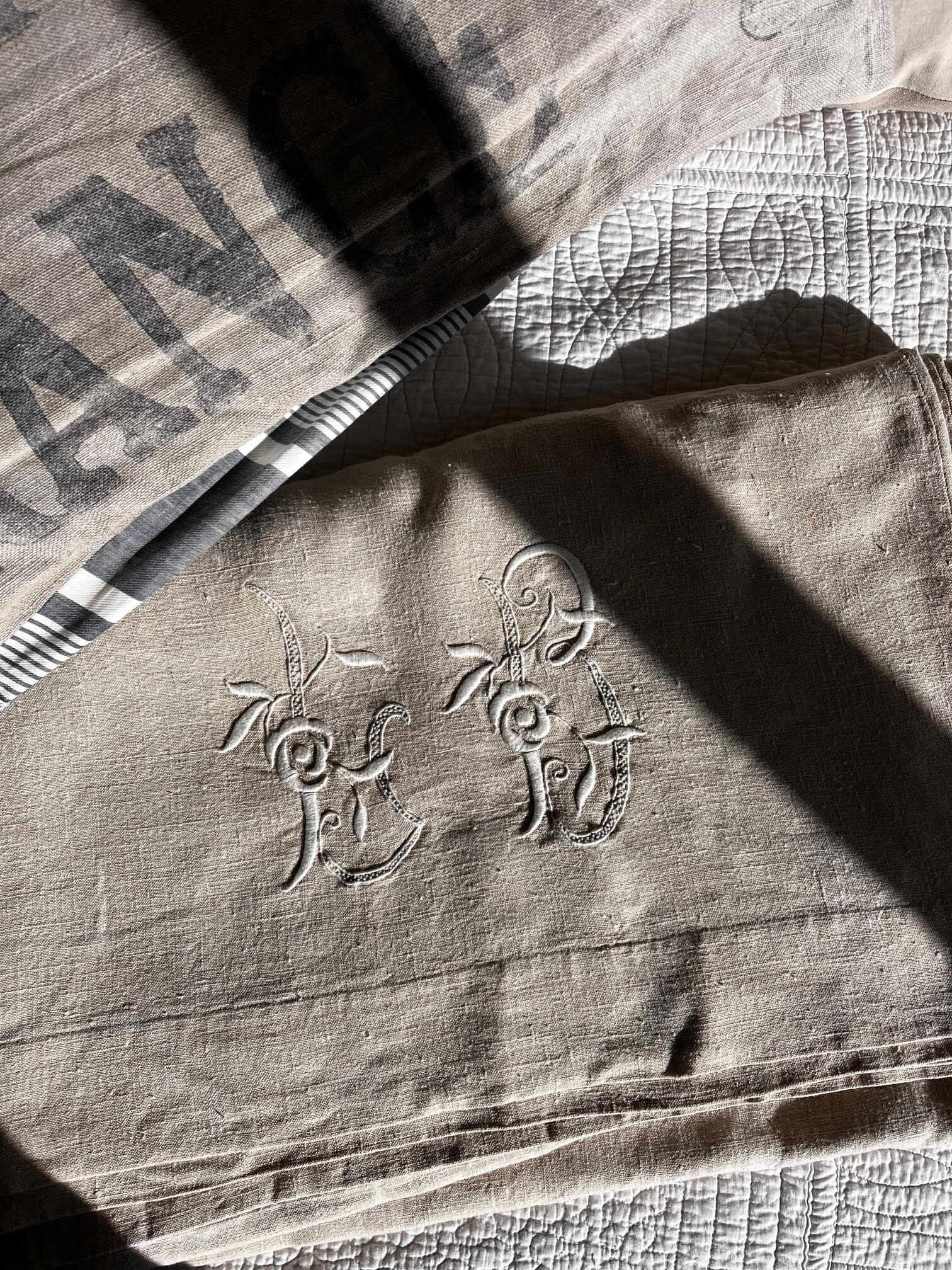 Drap ancien brodé LB en chanvre – Monogrammes anciens, pièce unique